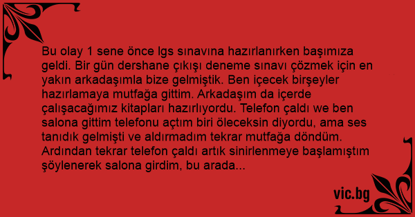 Bu olay 1 sene önce lgs sınavına hazırlanırken başımıza geldi. Bir gün dershane çıkışı deneme sınavı çözmek için en yakın arkadaşımla bize gelmiştik. Ben içecek birşeyler hazırlamaya mutfağa gittim. Arkadaşım da içerde çalışacağımız kitapları hazırlıyordu. Telefon çaldı we ben salona gittim telefonu açtım biri öleceksin diyordu, ama ses tanıdık gelmişti ve aldırmadım tekrar mutfağa döndüm. Ardından tekrar telefon çaldı artık sinirlenmeye başlamıştım şöylenerek salona girdim, bu arada arkadaşım da telefonun suİmamasına sinirlenmeye başlamıştı konsantre olamadığını söylüyorduki sesinde bi değişme oldu ve kesildi ben şaka yaptığını düşündüm ve telefonu açmaya gittim. Açtığımda yine aynı ses ölüceksin diyordu ve bende gülerek telefonu kapatım ve arkadaşımı azarlamak için odama doğru yöneldim. İçeri girdiğimde arkadaşımın kafası çalışma masasına düşmüştü bende bunu da şakanın bir parçası sanarak yanına gittim ve kafasını kaldırdım o an gördüklerim dün gibi aklımda değişik bir yüz ifadesi vardı çok korkmuşa benziyordu ve nefes almıyordu. Çok korktum ne yaİmam gerektiğini bilmiyordum annemi aramak için telefona koştum ama telefon meşgul sesi veriyordu giderek telaşlanmaya başlamıştım tekrar odama arkadaşımın yanına döndüm ama odada yoktu. Defterler ve kitaplar darmadağın olmuştu korkmaya başlamıştım çığlık attım ama sesim çıkmıyordu çıldırmak üzereydim ve ter içinde yataktan kalktım ışığı yaktım ve odama bir göz gezdirdim herşey yerli yerindeydi saat 3 tü korkunç bir kabus görmüştüm ve telefon çaldı sıçradım ama sonuçta herşey bir rüyaydı diyerek telefona gittim arayan arkadaşımdı çok berbat bir rüya gördüğünü ve hala etkisinde olduğunu söyledi. Anlattığı rüya tıpkı benim gördüğüm gibiydi o anda söylerim diken diken oldu. Bu ne anlama geliyordu?.