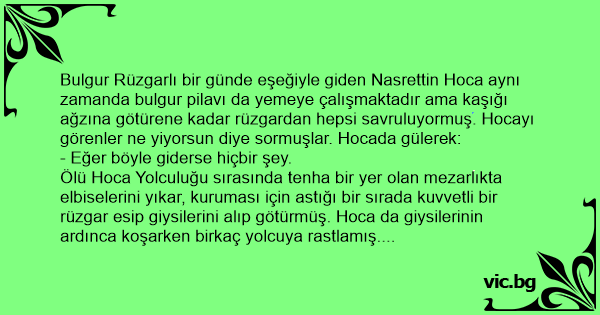 Bulgur Rüzgarlı bir günde eşeğiyle giden Nasrettin Hoca aynı zamanda bulgur pilavı da yemeye çalışmaktadır ama kaşığı ağzına götürene kadar rüzgardan hepsi savruluyormuş. Hocayı görenler ne yiyorsun diye sormuşlar. Hocada gülerek: