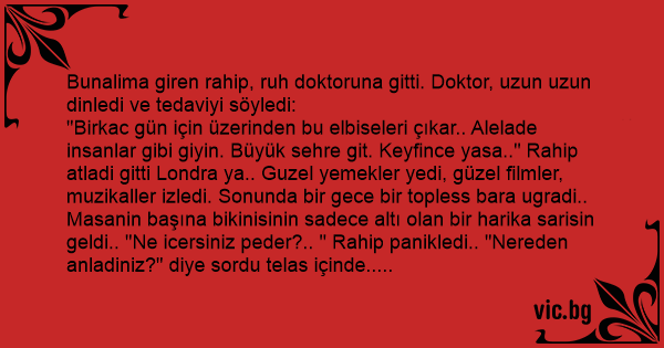 "Birkac gün için üzerinden bu elbiseleri çıkar.. Alelade insanlar gibi giyin. Büyük sehre giт. Keyfince yasa.." Rahip atladi gitti Londra ya.. Guzel yemekler yedi, güzel filmler, muzikaller izledi. Sonunda bir gece bir торlеss bara ugradi.. Masanin başına bikinisinin sadece altı olan bir harika sarisin geldi.. "Ne icersiniz peder?.. " Rahip panikledi.. "Nereden anladiniz?" diye sordu telas içinde.. "Bakin" dedi garson kiz.. "Ben Rahibe Teresa.. Benim doktorum da aynı.."