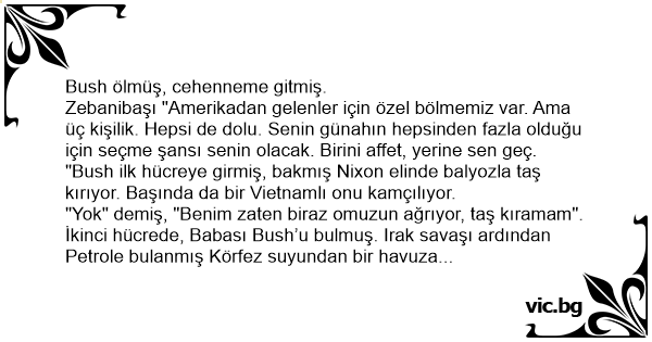 "Bush ilk hücreye girmiş, bakmış Nixon elinde balyozla taş kırıyor. Başında da bir Vietnamlı onu kamçılıyor.