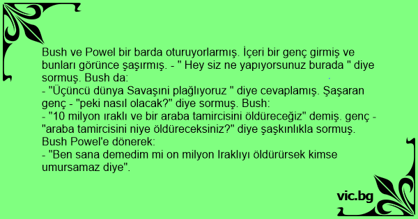 - "10 milyon ıraklı ve bir araba tamircisini öldüreceğiz" demiş. genç - "araba tamircisini niye öldüreceksiniz?" diye şaşkınlıkla sormuş. Bush Powel'e dönerek: