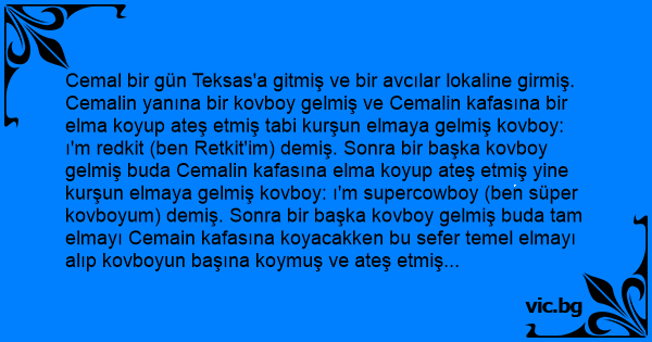Cemal bir gün Teksas'a gitmiş ve bir avcılar lokaline girmiş. Cemalin yanına bir kovboy gelmiş ve Cemalin kafasına bir elma koyup ateş etmiş tabi kurşun elmaya gelmiş kovboy: ı'm redkit (ben Retkit'im) demiş. Sonra bir başka kovboy gelmiş buda Cemalin kafasına elma koyup ateş etmiş yine kurşun elmaya gelmiş kovboy: ı'm supercowboy (ben süper kovboyum) demiş. Sonra bir başka kovboy gelmiş buda tam elmayı Cemain kafasına koyacakken bu sefer temel elmayı alıp kovboyun başına koymuş ve ateş etmiş kurşun kovboyun beynini dağıtmış bunun üzerine Cemal kovboya: ı'm sory (ben üzgünüm) demiş.