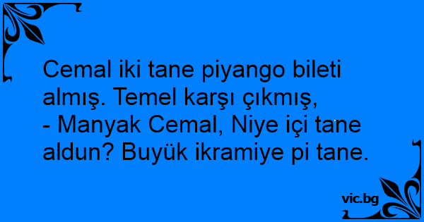 - Manyak Cemal, Niye içi tane aldun? Buyük ikramiye pi tane.