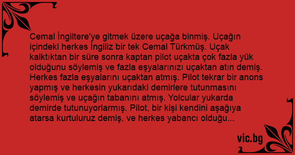 Cemal İngiltere'ye gitmek üzere uçağa binmiş. Uçağın içindeki herkes İngiliz bir tek Cemal Türkmüş. Uçak kalktıktan bir süre sonra kaptan pilot uçakta çok fazla yük olduğunu söylemiş ve fazla eşyalarınızı uçaktan atın demiş. Herkes fazla eşyalarını uçaktan atmış. Pilot tekrar bir anons yapmış ve herkesin yukarıdaki demirlere tutunmasını söylemiş ve uçağın tabanını atmış. Yolcular yukarda demirde tutunuyorlarmış. Pilot, bir kişi kendini aşağıya atarsa kurtuluruz demiş, ve herkes yabancı olduğu için Cemal'e bakmış. Cemal atlamayı kabul etmiş. Şöyle demiş: Ben kendimi uçaktan atacağım fakat atlamadan önce alkış isterim demiş.