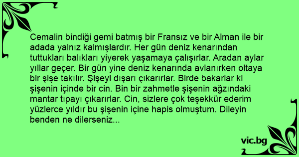Cemalin bindiği gemi batmış bir Fransız ve bir Alman ile bir adada yalnız kalmışlardır. Her gün deniz kenarından tuttukları balıkları yiyerek yaşamaya çalışırlar. Aradan aylar yıllar geçer. Bir gün yine deniz kenarında avlanırken oltaya bir şişe takılır. Şişeyi dışarı çıkarırlar. Birde bakarlar ki şişenin içinde bir cin. Bin bir zahmetle şişenin ağzındaki mantar tıpayı çıkarırlar. Cin, sizlere çok teşekkür ederim yüzlerce yıldır bu şişenin içine hapis olmuştum. Dileyin benden ne dilerseniz diyerek borcunu ödemek ister... Bunu duyunca biraz şaşırırlar.... Alman çok fazla beklemeden... Beni çabuk vatanıma gönder der.... Cin elinin bir hareketi ile Alman ortadan kaybolur... Bunu gören Fransız, beni de, beni de vatanıma gönder der, cin elini bir daha hareket ettirir Fransız da kaybolur. Cin Cemal'e bakar, sende son dileğini söyle de ben vatanıma gideyim artık der. Cemal biraz düşünür, ve dileğini söyler... Özledim ha o uşakları, geri getir onları.