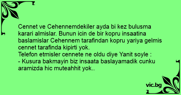 Cennet ve Cehennemdekiler ayda bi kez bulusma karari almislar. Bunun icin de bir kopru insaatina baslamislar Cehennem tarafindan kopru yariya gelmis cennet tarafinda kipirti yok.
