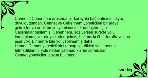 Cennetle Cehennem arasında bir karayolu bağlantısına ihtiyaç duyulduğundan, Cennet ve Cehennem yöneticileri bir araya gelmişler ve ortak bir yol yapılmasını kararlaştırmışlar. Çalışmalar başlamış. Cehennem, söz verilen sürede yolu tamamlamış ve ortaya kadar gelmiş, bakmış ki öbür tarafta yoldan eser yok. Bir metre bile yol yapılmamış daha. Hemen Cennet yöneticilerini arayıp, verdikleri sözü neden tutmadıklarını, yolu neden yapmadıklarını sormuşlar. Cennet yöneticileri boyun bükmüş: - "Kusura bakmayın, aradık taradık koskoca cennette bir müteahhit bulamadık."
