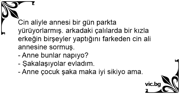 Cin aliyle annesi bir gün parkta yürüyorlarmış. arkadaki çalılarda bir kızla erkeğin birşeyler yaptığını farkeden cin ali annesine sormuş.