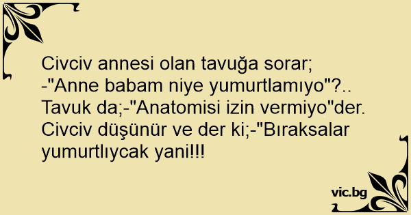 Civciv annesi olan tavuğa sorar;-"Anne babam niye yumurtlamıyo"?.. Tavuk da;-"Anatomisi izin vermiyo"der. Civciv düşünür ve der ki;-"Bıraksalar yumurtlıycak yani!!!