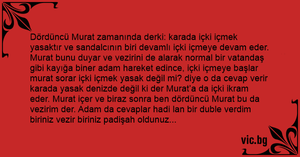 Dördüncü Murat zamanında derki: karada içki içmek yasaktır ve sandalcının biri devamlı içki içmeye devam eder. Murat bunu duyar ve vezirini de alarak normal bir vatandaş gibi kayığa biner adam hareket edince, içki içmeye başlar murat sorar içki içmek yasak değil mi? diye o da cevap verir karada yasak denizde değil ki der Murat’a da içki ikram eder. Murat içer ve biraz sonra ben dördüncü Murat bu da vezirim der. Adam da cevaplar hadi lan bir duble verdim biriniz vezir biriniz padişah oldunuz şişeyi versem biriniz Allah biriniz peygamber olursunuz der.