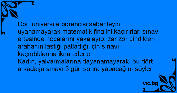 Kadın, yalvarmalarına dayanamayarak, bu dört arkadaşa sınavı 3 gün sonra yapacağını söyler.