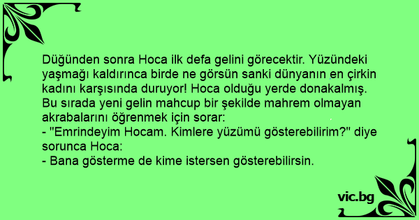 Düğünden sonra Hoca ilk defa gelini görecektir. Yüzündeki yaşmağı kaldırınca birde ne görsün sanki dünyanın en çirkin kadını karşısında duruyor! Hoca olduğu yerde donakalmış. Bu sırada yeni gelin mahcup bir şekilde mahrem olmayan akrabalarını öğrenmek için sorar: