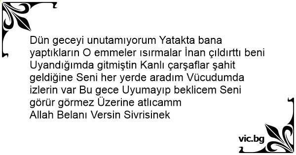 Dün geceyi unutamıyorum Yatakta bana yaptıkların O emmeler ısırmalar İnan çıldırttı beni Uyandığımda gitmiştin Kanlı çarşaflar şahit geldiğine Seni her yerde aradım Vücudumda izlerin var Bu gece Uyumayıp beklicem Seni görür görmez Üzerine atlıcamm
