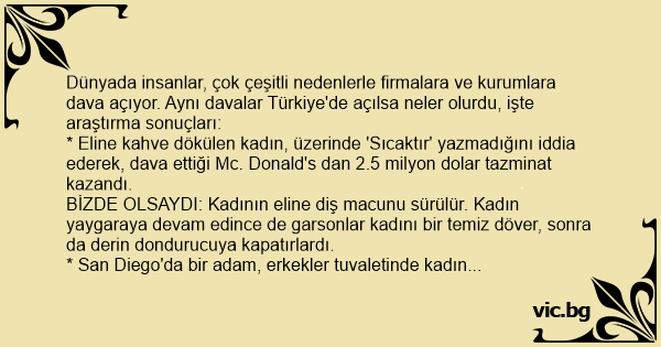 * Bira düşkünü bir Alman, Anheuser - Busch biraları üreten şirkete 10 bin dolarlık dava açtı. Biracıya göre reklamda birayla kadınların tavlanacağı söyleniyordu. Ancak kendisi başarılı olamamıştı. BİZDE OLSAYDI: Açtığı davanın ardından, derhal ana haber bültenlerine çıkar. Magazin programlarına konuk olur ve kendi çapında ciddi bir şöhrete ulaşırdı adam. Ve bu sayede kadın bulduğundan bira şirketi de tazminat ödemekten kurtulurdu.