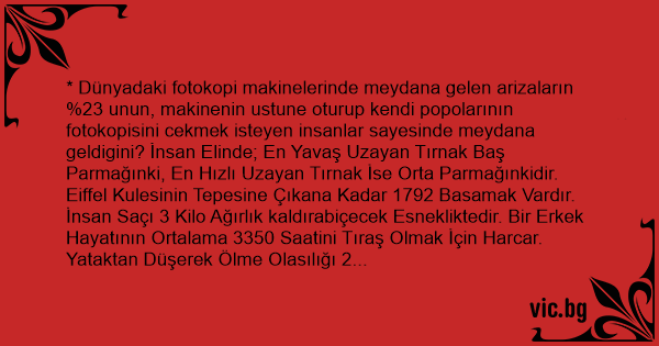 * Dünyadaki fotokopi makinelerinde meydana gelen arizaların %23 unun, makinenin ustune oturup kendi popolarının fotokopisini cekmek isteyen insanlar sayesinde meydana geldigini? İnsan Elinde; En Yavaş Uzayan Tırnak Baş Parmağınki, En Hızlı Uzayan Tırnak İse Orta Parmağınkidir. Eiffel Kulesinin Tepesine Çıkana Kadar 1792 Basamak Vardır. İnsan Saçı 3 Kilo Ağırlık kaldırabiçecek Esnekliktedir. Bir Erkek Hayatının Ortalama 3350 Saatini Tıraş Olmak İçin Harcar. Yataktan Düşerek Ölme Olasılığı 2 Milyonda 1'dir. İnsanlar Vücutlarında 300 Adet Kemikle Doğuyorlar Ama Yetişkin oldukçarında Bu Sayı 206'ya Düşüyor. Bir Karınca Kendi Ağırlığının 50 Katı Ağırlığı kaldırabilir. Filler Zıplayamayan Tek Memelilerdir. Zürafaların Ses Telleri Yoktur. Zürafalar 35 Cm Uzunluğunda Siyah Bir Dile Sahiptirler. Kangurular Geri Geri Yürüyemezler. Kelebekler Ayaklarıyla Tat Alırlar. Kadınlar Erkeklere aranla 2 kaç Fazla Göz Kırpar. İnsan Vücudundaki En Güçlü kaç Dildir. Gözleri Açık Tutarak Hapşırmak İmkansızdır. Hapşururken Burnu yada Ağızı Kapamak, Felçe Neden Oluyor. Ayı inlerinin girişleri her zaman kuzeye bakar. değerli taşların çoğu birkaç elementten oluşur, sadece pırlanta tamamen karbondan oluşur. Kedilerin beyninde 32 adet kaç vardır. Bukalemunların dilleri, vücutlarından iki kaç daha uzundur. Global ısınma yüzünden yükselen deniz seviyesi 2050 yılında Shangai ve deniz kıyısındaki diğer cin şehirlerinde büyük sellere neden olacak. Bu sellerde 76 milyon kişi evsiz kalacak. Üzerinde barkodu olan ilk ürün Wrigleys marka sakızdır. Kereviz yerken harcanan kalori, kerevizin içindeki kaloriden daha fazladir. Sümüklü böceklerin dört tane burnu vardır. Bir devekuşunun gözu beyninden büyüktür. İnek sütünün pH değeri 6'dır. Bir timsahın gözlerinin arasındaki mesafe, ayaklarının büyüklüğüne eşittir. Dalmaçyalılar gut olmayan tek köpek cinsidir. Hipopotamlar insandan daha hızlı koşarlar. Meşe ağaçları elli yaşına gelmeden meşe palamudu üretemezler. Aslanlar bir günde 50 kez sevişebilirler. İnsan elinde, en yavaş uzayan tırnak baş Parmağınki, en hızlı uzayan tırnak ise orta parmağınkidir. Hawaii alfabesinde sadece 12 harf bulunmaktadır. Güney Kore başkenti Seul, Kore dilinde "başkent"anlamına gelmektedir. Kanada, Kızılderili dilinde "büyük koy"anlamina gelmektedir. İngilizcedeki Wendy ismi, Peter Pan hikayesinde kullanılmak üzere uydurulmuştur. Avustralya'daki tuvaletlerin sifon suları saat yönünde akar. ABD'de, yaşları 20 ile 29 arasında olan zenci erkeklerin ücte biri ya hapiste ya da gözaltinda tutulmaktadır. Ortalama bir erkek, hayatinin 3350 saatini tiraş olmak için harcar. Gecen 3500 yılın, sadece 230 yılı barış içinde yaşanmıştır. Sallanan sandalyede hiç durmadan sallanma rekoru 440 saattir. Bir cam kırıldığında, ufalanan parçalar saatte üç bin millik bir hızla etrafa saçılır. İnsan saçı, üç kilo ağırlik kaldırabiçecek esnekliktedir. Gunumuzde, evlenenlerin yuzde ellisi bo$anmaktadir. Beethoven beste yapmadan Önce kafasini soguk suya sokardi. Her 25 ki$iden biri astim hastasidir. Dunyadaki hayvanlarin yuzde sekseni alti ayaklidir. aranus, ciplak gozle gorulebilen bir gezegendir. Kaptan Cook, Antarktika haric Bütün kitalara ayak basan ilk insandir. Guni$igindan daha fazla yararlanmak icin saat uygulamasini Benjamin aranklin ba$latmi$tir. Bir okyanusun en derin yerinde, demir bir topun dibe cokmesi bir saatten uzun sürer. Bugune kadar olculmu$ en büyük buz dagi, 200 mil uzunlugunda ve 60 mil geni$ligindedir ve Belcika'dan daha büyük bir yuzolcumune sahiptir. Bugune kadar kaydedilmi$ en büyük dalga, 1971 yilinda Japonya'nin ishigaki Adasi'nda 85 metre yuksekligine ula$mi$tir. Acik bir gecede, ciplak gozle iki bin ayri yildizi gormek mumkundur. Sahra colundeki Tidikelt kasabasina on yıl boyunca hic yagmur yaİmami$tir. Ba$kaç John F. Kenndy, yirmi dakikada dort gazete okuyabilirdi. Mumyaların ayak parmaklari tek tek sarilarak mumyalanmi$tir. Dunyadaki ilk telefon rehberinde sadece elli isim yer almi$ti. 1878 yilinin $ubat ayinda Connecticut New Haven'da yayimlanmi$ti. Yataktan du$erek olme olasiligi iki milyonda birdir. Ünlu cizgi film kahramani Temel Reis, 1919 yilinda Elzie Crisler Segar tarafından yaratildi. İlk cama$ir makinesi 1907 yilinda Hurley Machine Co. tarafından pazarlandi. Kita isimlerinin hepsi aynı harfle ba$layip aynı harfle biter. Herhangi bir okyanusun en uzak olduğu nokta cin'dir. Ki$ aylarinda, Moskova'daki buz pateni pistleri 250 bin metrekarelik bir alani kaplar. Rusya'da dogudan batiya dogru seyahat edilirse, yedi saat ku$agi gecilir. Norvec'in kuzeyinde, her yaz 14 hafta gece gunduz gune$li geçer. Sadece di$i sivrisinekler isirir. Dunyada her dakika iki tane du$uk $iddette deprem olmaktadir. Hindistan'daki yıllık dogum sayisi, Avustralya'nin toplam nufusundan fazladir. Rusya'nin dortte biri ormanlarla kaplidir. Tarih boyunca yeryuzunde bulunan altin 200 kaç daha fazlasi okyanuslarda bulunmaktadir. Kopeklerin ter bezleri ayaklarindadir. Yazar Rudyard Kipling sadece siyah murekkep kullanirdi. Mickey Mouse'dan Önce en me$hur cizgi film kahramani Felix The Cat'di. Larry Hagman (JR. )Dallas dizisinin setinde hic kimsenin sigara icmesine izin vermezdi. Salataligin yuzde 96'si sudur. Bir kilo limonda bir kilo cilekten daha fazla $eker vardir. Peru'da hic umumi tuvalet yoktur. Timsahlar renk korudur. Yarim kilo bal yapabilmek icin arilar iki milyondan fazla cicekten bitki ozu toplamak zorundadirlar. Sadece di$i kanaryalar otebilir. Tarantulalar iki bucuk yıl yiyeceksiz ya$ayabilirler. Havuca rengini karoten verir. İnciler sirkede erir. Venus saat yonunde dönen tek gezegendir. İnternetin yıllık buyume yuzdesi 314. 000'dir. Rodin'in unlu ‘Du$unen Adam' heykeli aslinda İtalyan $air Dante'nin portresidir. En fazla asfaltli yola 