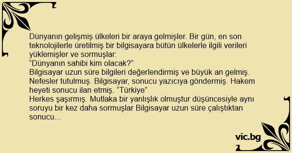 Herkes şaşırmış. Mutlaka bir yanlışlık olmuştur düşüncesiyle aynı soruyu bir kez daha sormuşlar Bilgisayar uzun süre çalıştıktan sonucu yazıcıya göndermiş. “Türkiye”