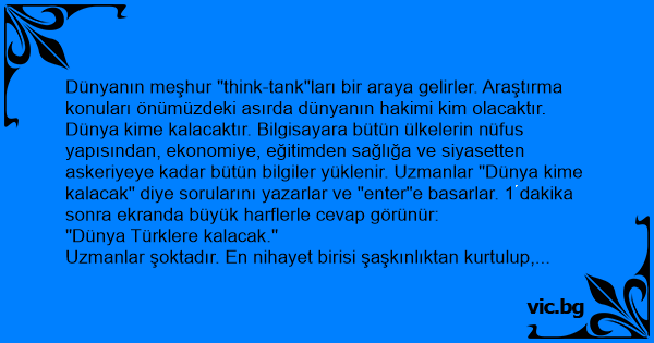 Dünyanın meşhur "think-tank"ları bir araya gelirler. Araştırma konuları önümüzdeki asırda dünyanın hakimi kim olacaktır. Dünya kime kalacaktır. Bilgisayara bütün ülkelerin nüfus yapısından, ekonomiye, eğitimden sağlığa ve siyasetten askeriyeye kadar bütün bilgiler yüklenir. Uzmanlar "Dünya kime kalacak" diye sorularını yazarlar ve "enter"e basarlar. 1 dakika sonra ekranda büyük harflerle cevap görünür: