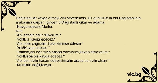 Dağıstanlılar kavga etmeyi çok severlermiş. Bir gün Rus'un biri Dağıstanlının arabasına çarpar. İçinden 3 Dağıstanlı çıkar ve adama: