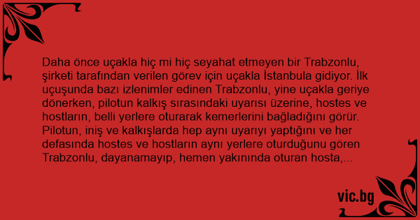 Pilotun, iniş ve kalkışlarda hep aynı uyarıyı yaptığını ve her defasında hostes ve hostların aynı yerlere oturduğunu gören Trabzonlu, dayanamayıp, hemen yakınında oturan hosta, kısık bir sesle,
