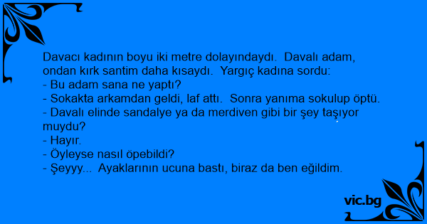 Davacı kadının boyu iki metre dolayındaydı. Davalı adam, ondan kırk santim daha kısaydı. Yargıç kadına sordu: