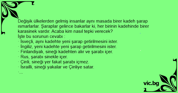 Değişik ülkelerden gelmiş insanlar aynı masada birer kadeh şarap ısmarlarlar. Şaraplar gelince bakarlar ki, her birinin kadehinde birer karasinek vardır. Acaba kim nasıl tepki verecek?