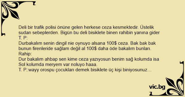 Deli bir trafik polisi önüne gelen herkese ceza kesmektedir. Üstelik sudan sebeplerden. Bigün bu deli bisiklete binen rahibin yanına gider