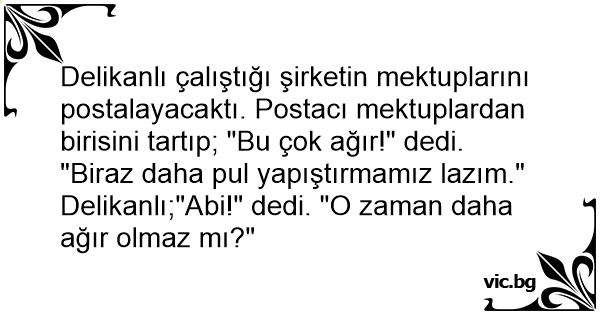 Delikanlı çalıştığı şirketin mektuplarını postalayacaktı. Postacı mektuplardan birisini tartıp; "Bu çok ağır!" dedi. "Biraz daha pul yapıştırmamız lazım."