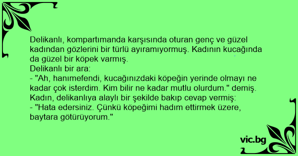 Delikanlı, kompartımanda karşısında oturan genç ve güzel kadından gözlerini bir türlü ayıramıyormuş. Kadının kucağında da güzel bir köpek varmış.