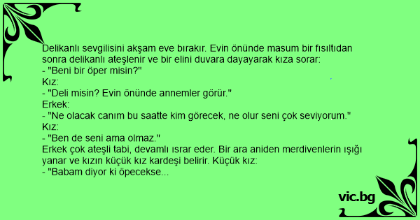 Delikanlı sevgilisini akşam eve bırakır. Evin önünde masum bir fısıltıdan sonra delikanlı ateşlenir ve bir elini duvara dayayarak kıza sorar: