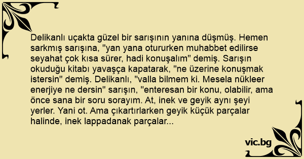 Delikanlı uçakta güzel bir sarışının yanına düşmüş. Hemen sarkmış sarışına, "yan yana otururken muhabbet edilirse seyahat çok kısa sürer, hadi konuşalım" demiş. Sarışın okuduğu kitabı yavaşça kapatarak, "ne üzerine konuşmak istersin" demiş. Delikanlı, "valla bilmem ki. Mesela nükleer enerjiye ne dersin" sarışın, "enteresan bir konu, olabilir, ama önce sana bir soru sorayım. At, inek ve geyik aynı şeyi yerler. Yani ot. Ama çıkartırlarken geyik küçük parçalar halinde, inek lappadanak parçalar halinde, at da pişmaniye topları gibi çıkartır. Neden olduğunu biliyor musun" delikanlı, "valla en ufak bi fikrim yok" demiş. Bunun üzerine sarışın, "bi boktan anlamazken nükleer enerjiyi nasıl tartışabileceğini zannediyorsun" demiş.