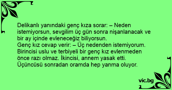 Delikanlı yanındaki genç kıza sorar: – Neden istemiyorsun, sevgilim üç gün sonra nişanlanacak ve bir ay içinde evleneceğiz biliyorsun.
