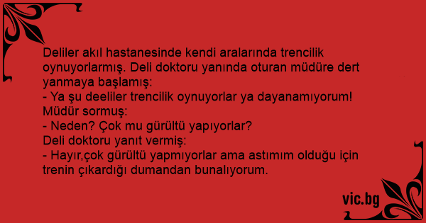 Deliler akıl hastanesinde kendi aralarında trencilik oynuyorlarmış. Deli doktoru yanında oturan müdüre dert yanmaya başlamış: