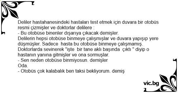 Delilerin hepsi otobüse binmeye çalışmışlar ve duvara yapışıp yere düşmüşler. Sadece hasta bu otobüse binmeye çalışmamış. Doktorlarda sevinerek "işte bir tane aklı başında çıktı " diyip o hastanın yanına gitmişler ve ona sormuşlar.