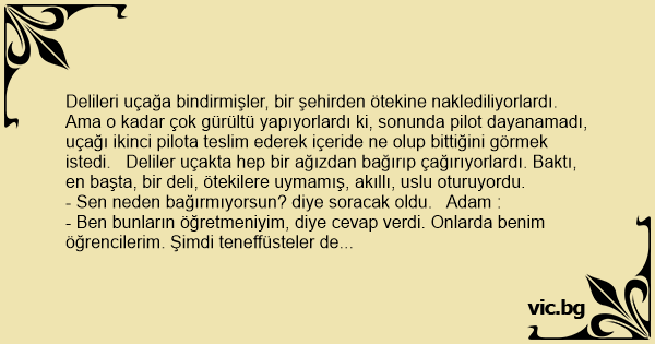 - Aman çok güzel! diye sevindi. Herhalde kendinin öğretmen olduğunu sanan deli, ötekileri derse almış olsa gerek, diye düşündü. Ama dakikalar geçiyor, arkadan hiç bir ses seda çıkmıyordu. Pilot biraz daha bekledikten sonra merak etti. Gidip bakmak istedi. Bir de ne görsün! Uçağın kapısı açık ve içeride öğretmenden başka kimsecikler yok değil mi! Dehşetle sordu :