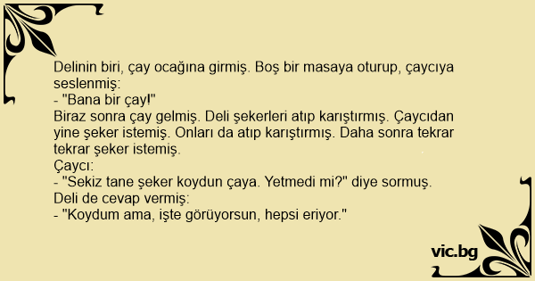 - "Sekiz tane şeker koydun çaya. Yetmedi mi?" diye sormuş.