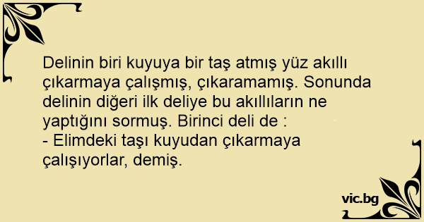 Delinin biri kuyuya bir taş atmış yüz akıllı çıkarmaya çalışmış, çıkaramamış. Sonunda delinin diğeri ilk deliye bu akıllıların ne yaptığını sormuş. Birinci deli de :