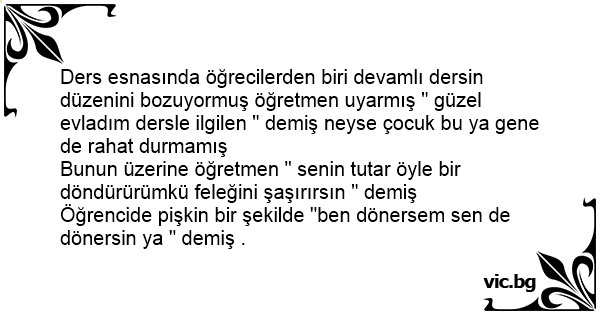 Ders esnasında öğrecilerden biri devamlı dersin düzenini bozuyormuş öğretmen uyarmış " güzel evladım dersle ilgilen " demiş neyse çocuk bu ya gene de rahat durmamış