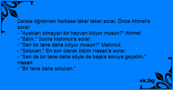 - "Ayakları olmayan bir hayvan biliyor musun?" Ahmet: