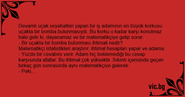 Devamlı uçak seyahatleri yapan bir iş adamının en büyük korkusu uçakta bir bomba bulunmasıydı. Bu korku o kadar karşı konulmaz hale gelir ki, dayanamaz ve bir matematikçiye gelip sorar: