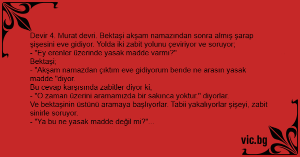 Devir 4. Murat devri. Bektaşi akşam namazından sonra almış şarap şişesini eve gidiyor. Yolda iki zabit yolunu çeviriyor ve soruyor;