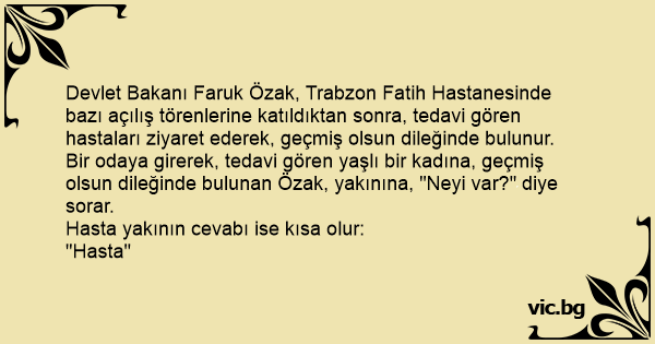 Bir odaya girerek, tedavi gören yaşlı bir kadına, geçmiş olsun dileğinde bulunan Özak, yakınına, "Neyi var?" diye sorar.