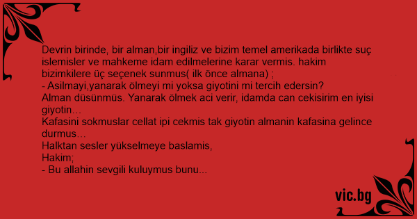 Devrin birinde, bir alman,bir ingiliz ve bizim temel amerikada birlikte suç islemisler ve mahkeme idam edilmelerine karar vermis. hakim bizimkilere üç seçenek sunmus( ilk önce almana) ;