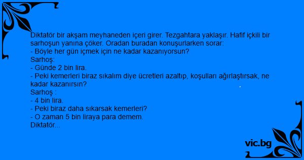 Diktatör bir akşam meyhaneden içeri girer. Tezgahtara yaklaşır. Hafif içkili bir sarhoşun yanına çöker. Oradan buradan konuşurlarken sorar: