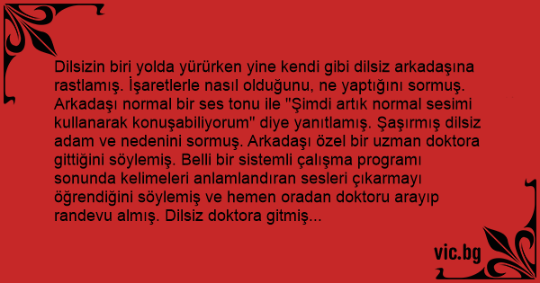 Dilsizin biri yolda yürürken yine kendi gibi dilsiz arkadaşına rastlamış. İşaretlerle nasıl olduğunu, ne yaptığını sormuş. Arkadaşı normal bir ses tonu ile "Şimdi artık normal sesimi kullanarak konuşabiliyorum" diye yanıtlamış. Şaşırmış dilsiz adam ve nedenini sormuş. Arkadaşı özel bir uzman doktora gittiğini söylemiş. Belli bir sistemli çalışma programı sonunda kelimeleri anlamlandıran sesleri çıkarmayı öğrendiğini söylemiş ve hemen oradan doktoru arayıp randevu almış. Dilsiz doktora gitmiş ve doktor "Soyun ve şu divanın üzerine yüzükoyun yat, şimdi geliyorum" demiş. Dilsiz, birazdan yattığı yerden başını çevirip bakmış ki doktor elinde kısa bir süpürge sapı, tahta bir balyoz ve bir kavanoz vazelinle geliyor. Doktor süpürge sapını vazelinleyip dikkatlice yerleştirmiş. Balyoz ile sopanın tepesine vurması ile dilsiz "Aaaaaaaaaa!!!" diye bağırarak fırlamış. Bunun üzerine doktor "Çok güzel… Önümüzdeki salı -B- planı ile devam edeceğiz" demiş…