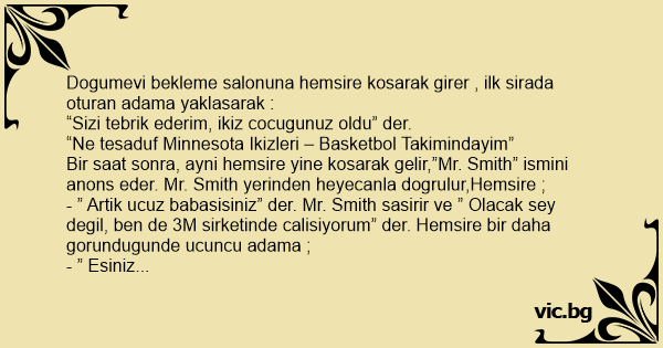 - ” Artik ucuz babasisiniz” der. Mr. Smith sasirir ve ” Olacak sey degil, ben de 3M sirketinde calisiyorum” der. Hemsire bir daha gorundugunde ucuncu adama ;