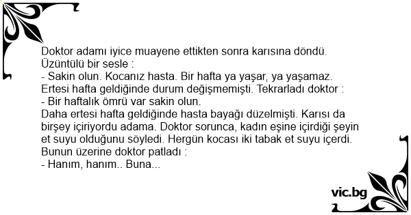 Daha ertesi hafta geldiğinde hasta bayağı düzelmişti. Karısı da birşey içiriyordu adama. Doktor sorunca, kadın eşine içirdiği şeyin et suyu olduğunu söyledi. Hergün kocası iki tabak et suyu içerdi. Bunun üzerine doktor patladı :