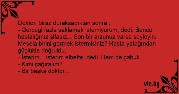 - Gerceği fazla saklamak istemiyorum, dedi. Bence hastalığınız şifasız... Son bir arzunuz varsa söyleyin. Mesela birini gormek istermisiniz? Hasta yatağından güçlükle doğruldu.