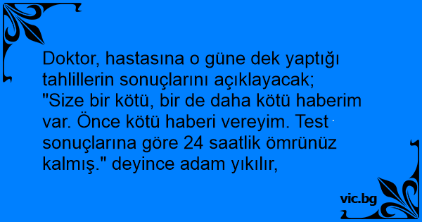 "Size bir kötü, bir de daha kötü haberim var. Önce kötü haberi vereyim. Test sonuçlarına göre 24 saatlik ömrünüz kalmış." deyince adam yıkılır,