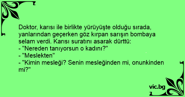 Doktor, karısı ile birlikte yürüyüşte olduğu sırada, yanlarından geçerken göz kırpan sarışın bombaya selam verdi. Karısı suratını asarak dürttü:
