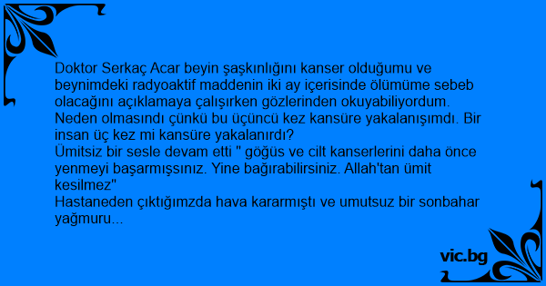 Doktor Serkaç Acar beyin şaşkınlığını kanser olduğumu ve beynimdeki radyoaktif maddenin iki ay içerisinde ölümüme sebeb olacağını açıklamaya çalışırken gözlerinden okuyabiliyordum. Neden olmasındı çünkü bu üçüncü kez kansüre yakalanışımdı. Bir insan üç kez mi kansüre yakalanırdı?